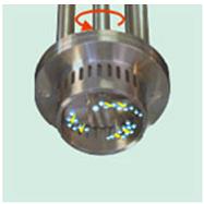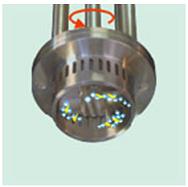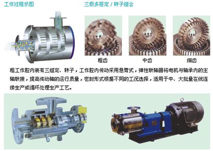 在高速旋转的转子外端产生至少15m/s以上的线速度,可至40m/s,并形成强烈的机械及液力剪切、液层摩擦、撞击撕裂,使物料充分的分散、乳化、均质、破碎、同时通过定子槽射出。